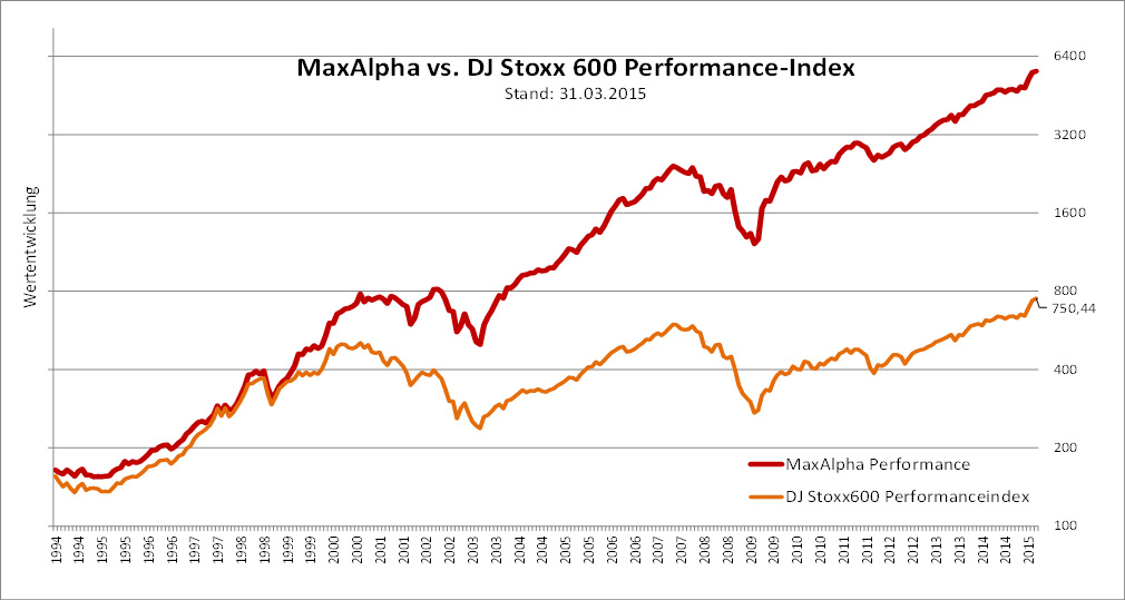 Die abgebildeten Performanceergebnisse stellen den Verlauf des MaxAlpha Ansatzes, jeweils getrennt nach Europa (mit Währungsanteil) und Euroland (ohne Währungsanteil) dar.